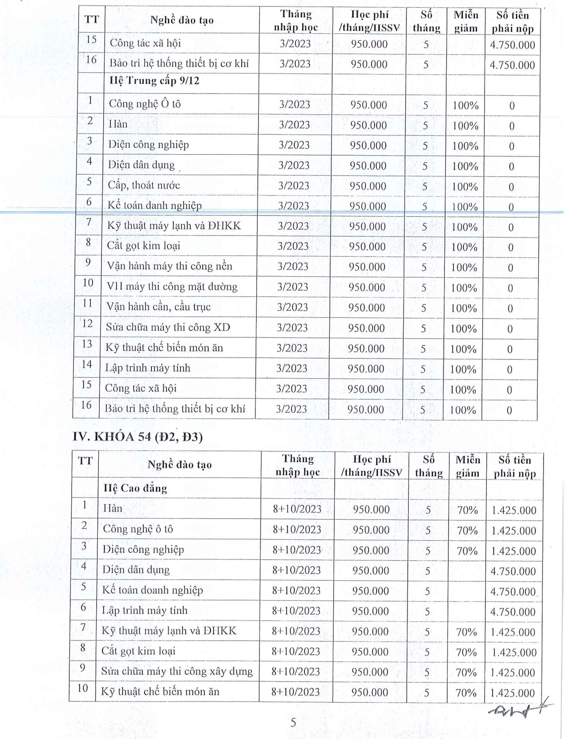 Thông báo về việc Thu học phí đối với các nghề đào tạo hệ Cao đẳng, trung cấp học kỳ I năm học 2023-2024